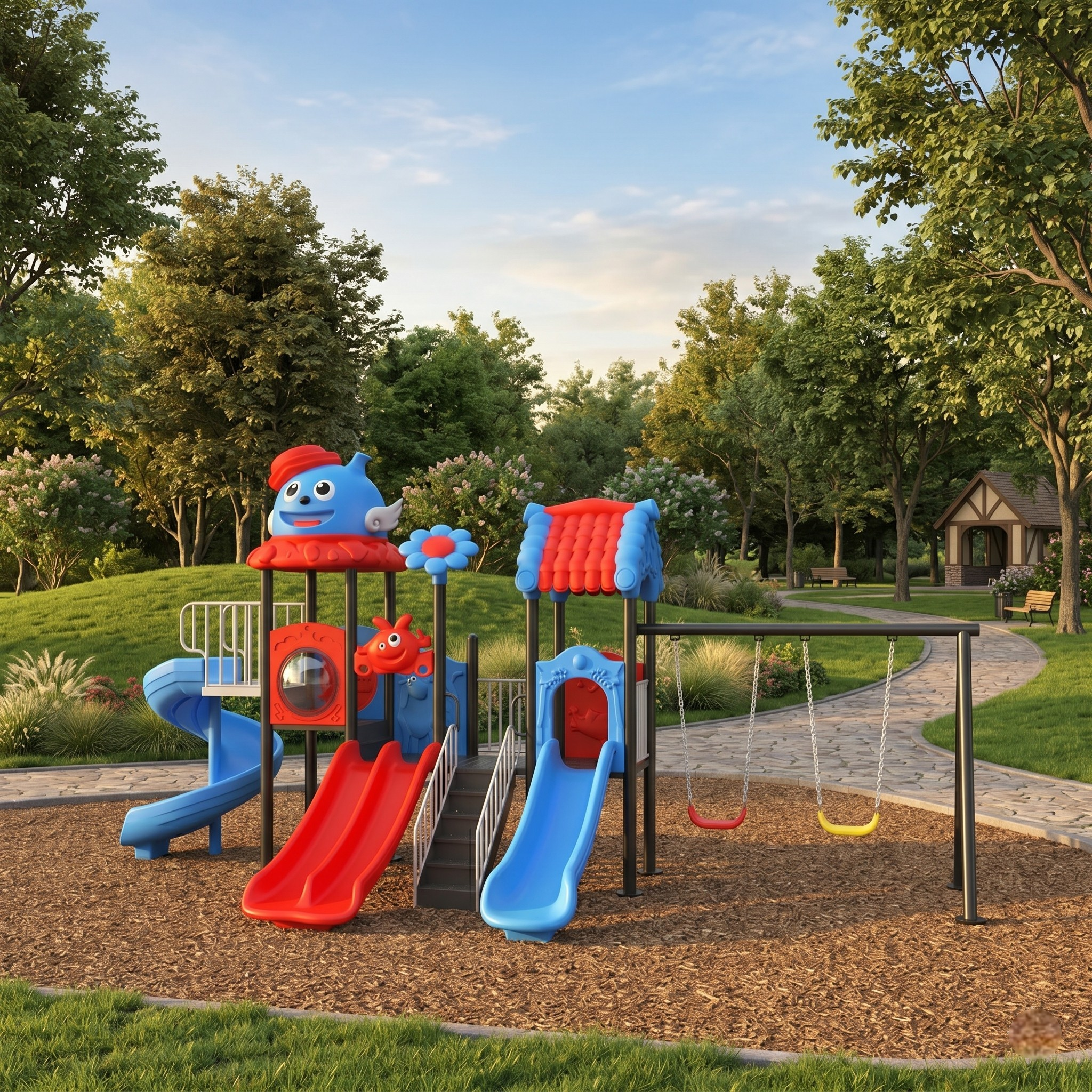 | Комплектация | Беседка, Горка, Двойная горка, Качели, Лесенка, Спиральная горка |
