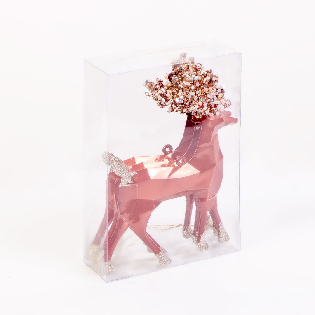 Размер игрушек составляет 15×13 см, что делает их достаточно крупными и заметными на ветках елки. Упаковка представлена прозрачной пластиковой коробкой, которая позволяет полностью насладиться красотой и оригинальностью каждой игрушки. В упаковке, представляющей собой прозрачную пластиковую коробку, содержится 3 ёлочных игрушки Twinkles элегантного бордового оттенка с блестками. Глянцевая поверхность является причиной сияния этих оленят.