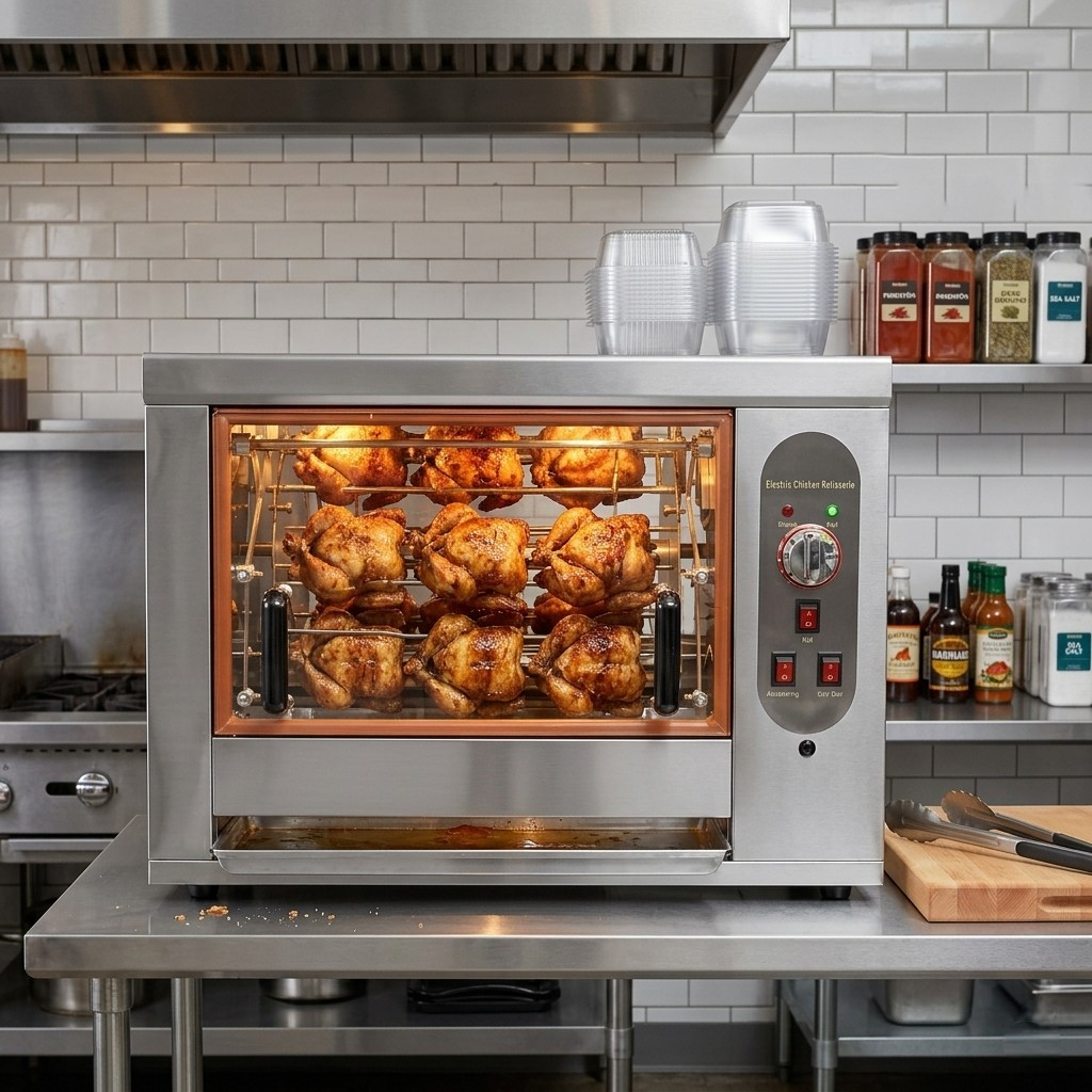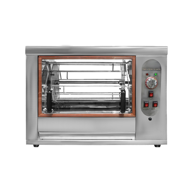 Аппарат подключается в сеть напряжением 220 В, оборудован резиновыми колесами с фиксаторами, чтобы готовые курочки не укатились. Панель управления расположена на лицевой стороне, рядом с дверцей. Гриль не занимает много места, его размеры: 60х80х61 см. При таких скромных габаритах он рассчитан, тем не менее, на 6 тушек среднего размера.
