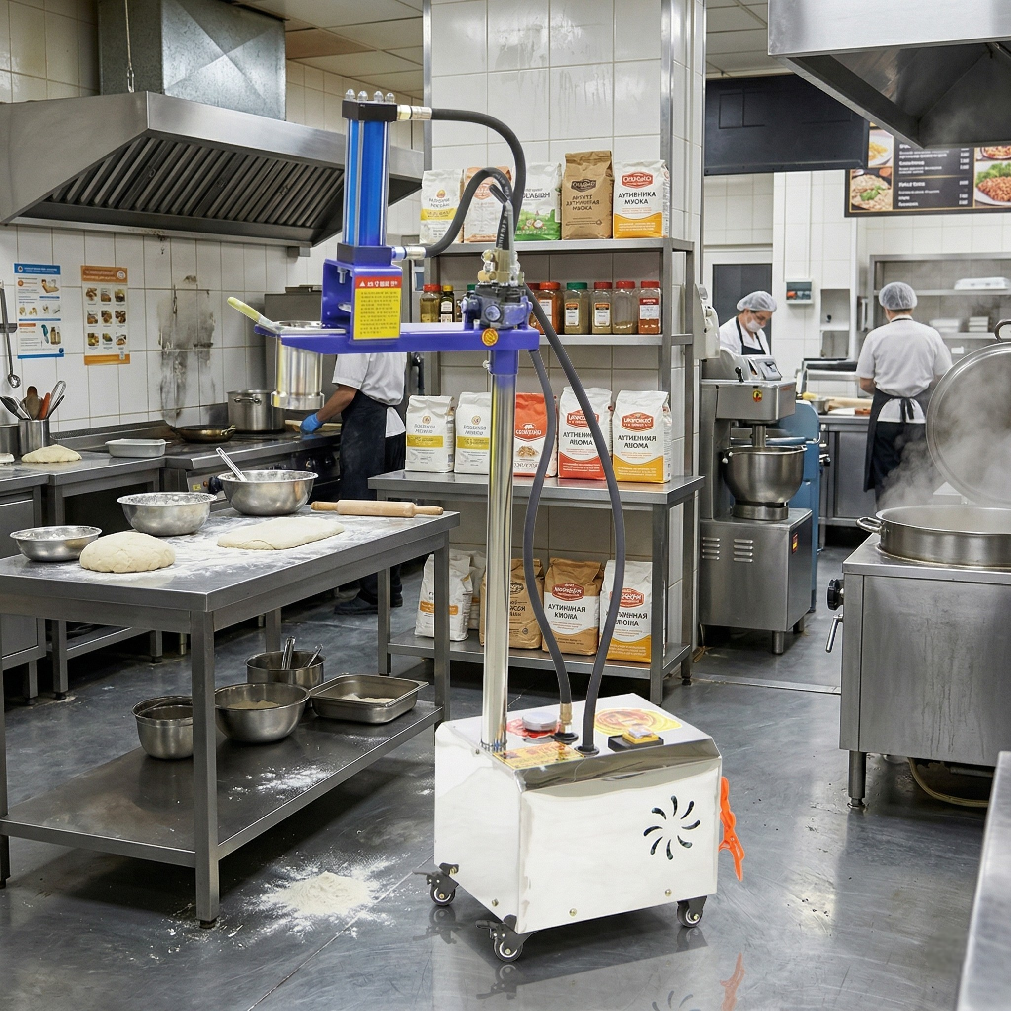 Аппарат небольшой, его габариты 600*200*600 мм. Имеет одну секцию для приготовления лапши. За минуту совершает 144 оборота и может приготовить целую порцию лапши для лагмана всего за 10 секунд. Этот агрегат намного увеличит эффективность производства и объёмы выполняемых заказов, не занимая при этом много места на кухне.