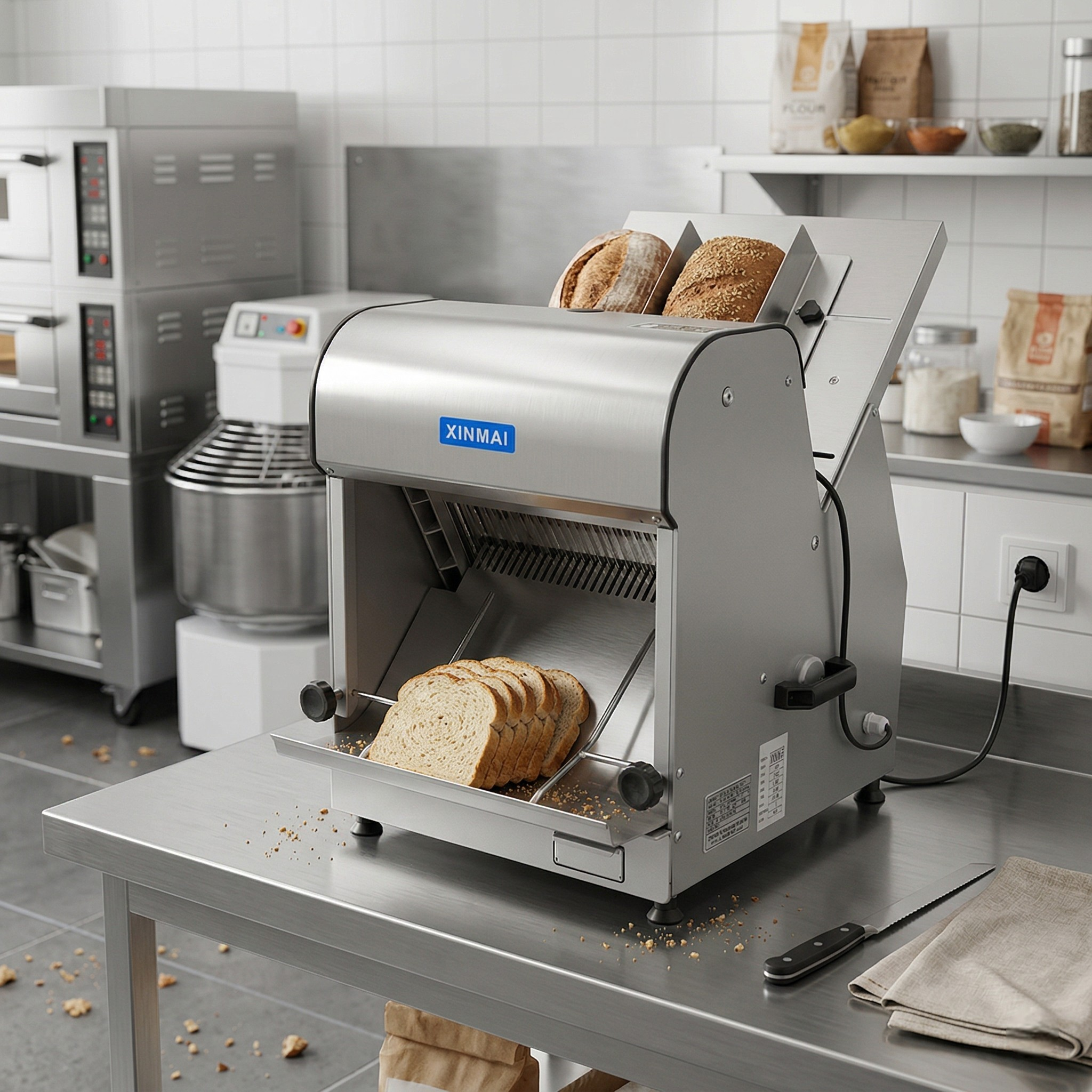 Работает от бытовой электросети напряжением 220В и потребляет 370 Вт. Это относительно небольшие затраты за тот объём работы, который выполняет этот аппарат по разрезке хлеба. При этом каждый кусочек булки будет иметь одинаковую толщину в 15 мм, что немаловажно для красивой сервировки стола.
