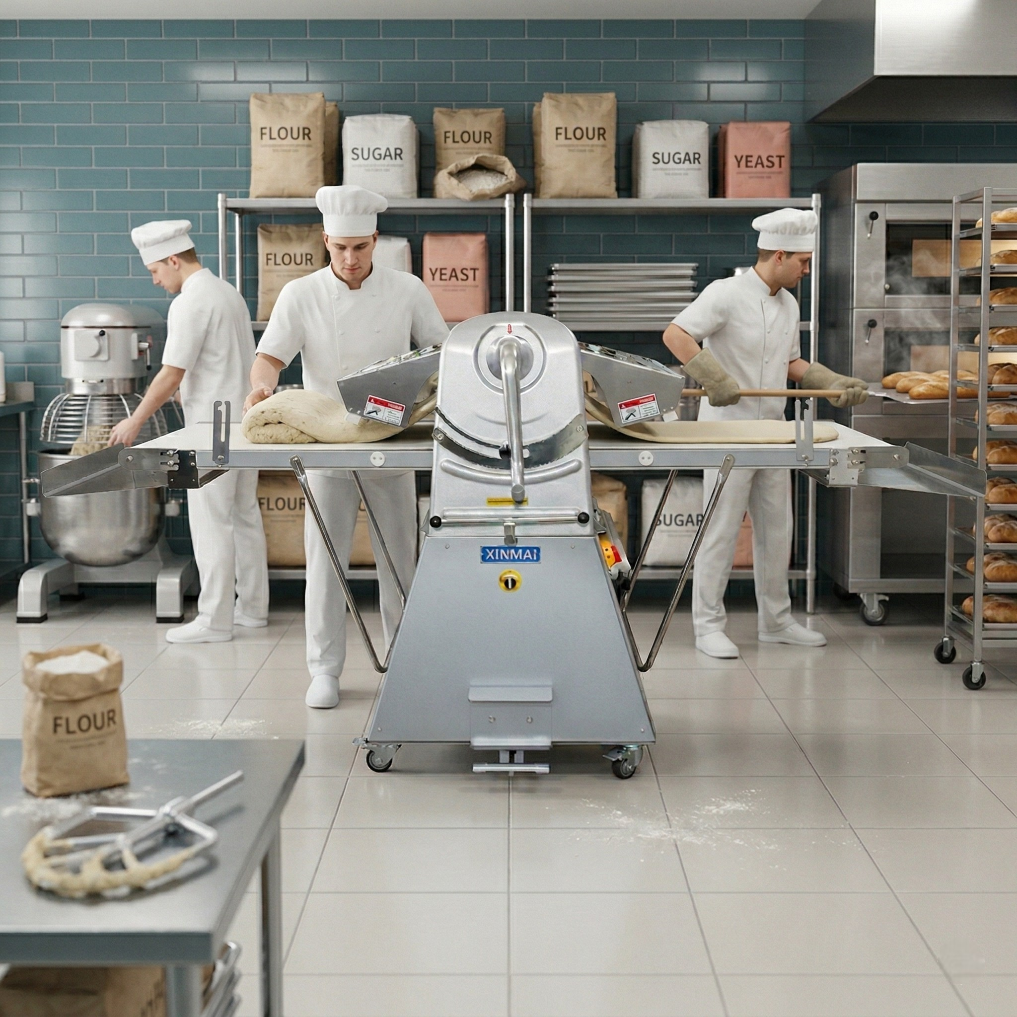 Аппарат изготовлен из нержавеющей стали, не оставит постороннего привкуса или запаха при работе с любым тестом. Он способен обрабатывать готовое тесто любой консистенции – мягкое, тугое или дрожжевое. Управляется машина электромеханическим способом, в некоторых ситуациях раскатать пласт удастся вручную. Просвет между раскаточными валиками регулируется в зависимости от необходимой толщины пласта от 1 до 50 мм. А значит, на нем можно производить любые мучные изделия, что значительно облегчает процесс заготовок и повышает производительность. Для машины такого уровня аппарат обладает компактными размерами и впишется в кухни небольших размеров. Он мобилен, колеса на его станине позволяют легко перемещать машину. Лотки быстро собираются, еще больше экономя рабочее пространство.