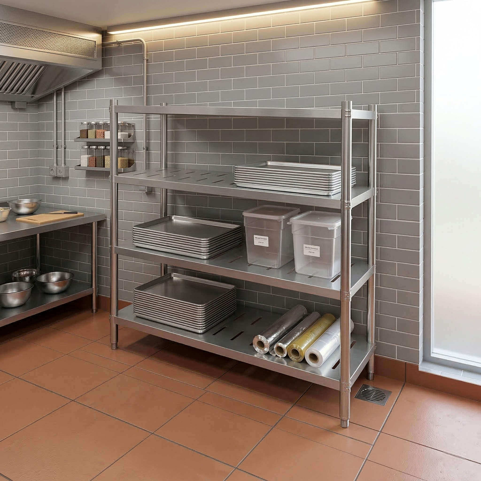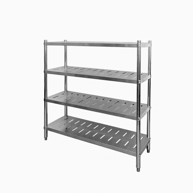 Вся конструкция изготовлена из высококачественной нержавеющей стали, легкой в уходе, не подверженной коррозии, прочной и долговечной. Четыре полки расположены на расстоянии 35 см друг от друга, чем достигается удобное размещение различных предметов. Полки имеют перфорацию, аккуратные отверстия позволяют воздуху свободно циркулировать, способствуя поддержанию оптимального микроклимата и препятствуя развитию бактерий.