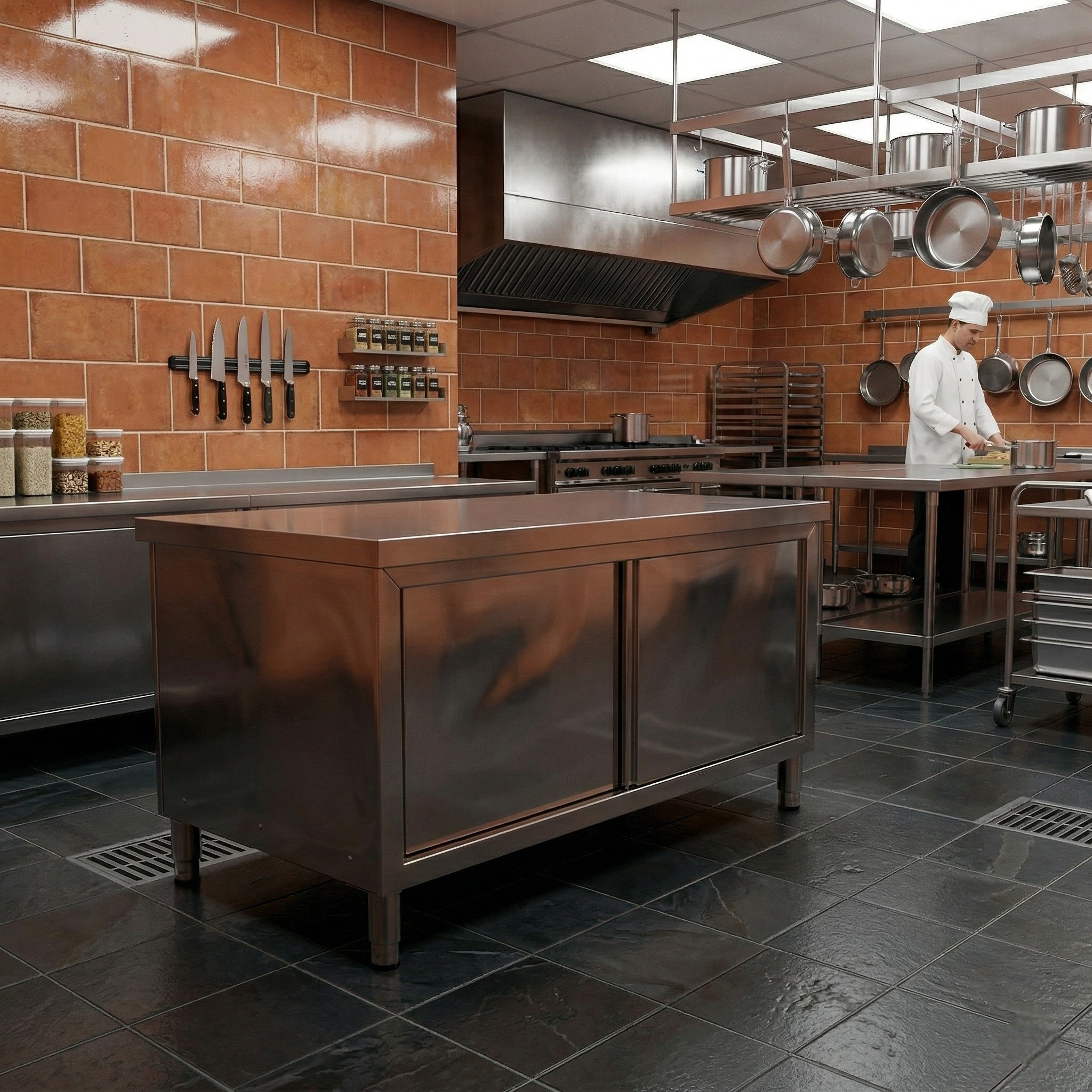 Разделочный стол-шкаф позволяет не только разделывать продукты на своей столешнице, но и хранить необходимые инструменты и продукты под рукой, повышая производительность труда.