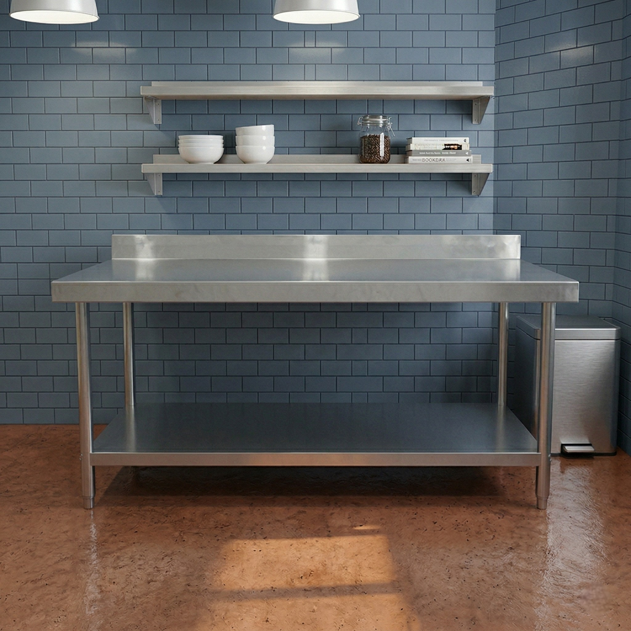 Рассматриваемый стол имеет размеры 180*80*80 см, что предполагает его использование в достаточно просторных помещениях. Для удобства он оснащен дополнительной полкой, где можно хранить кухонную утварь или ингредиенты, которые должны быть под рукой в кулинарном процессе.