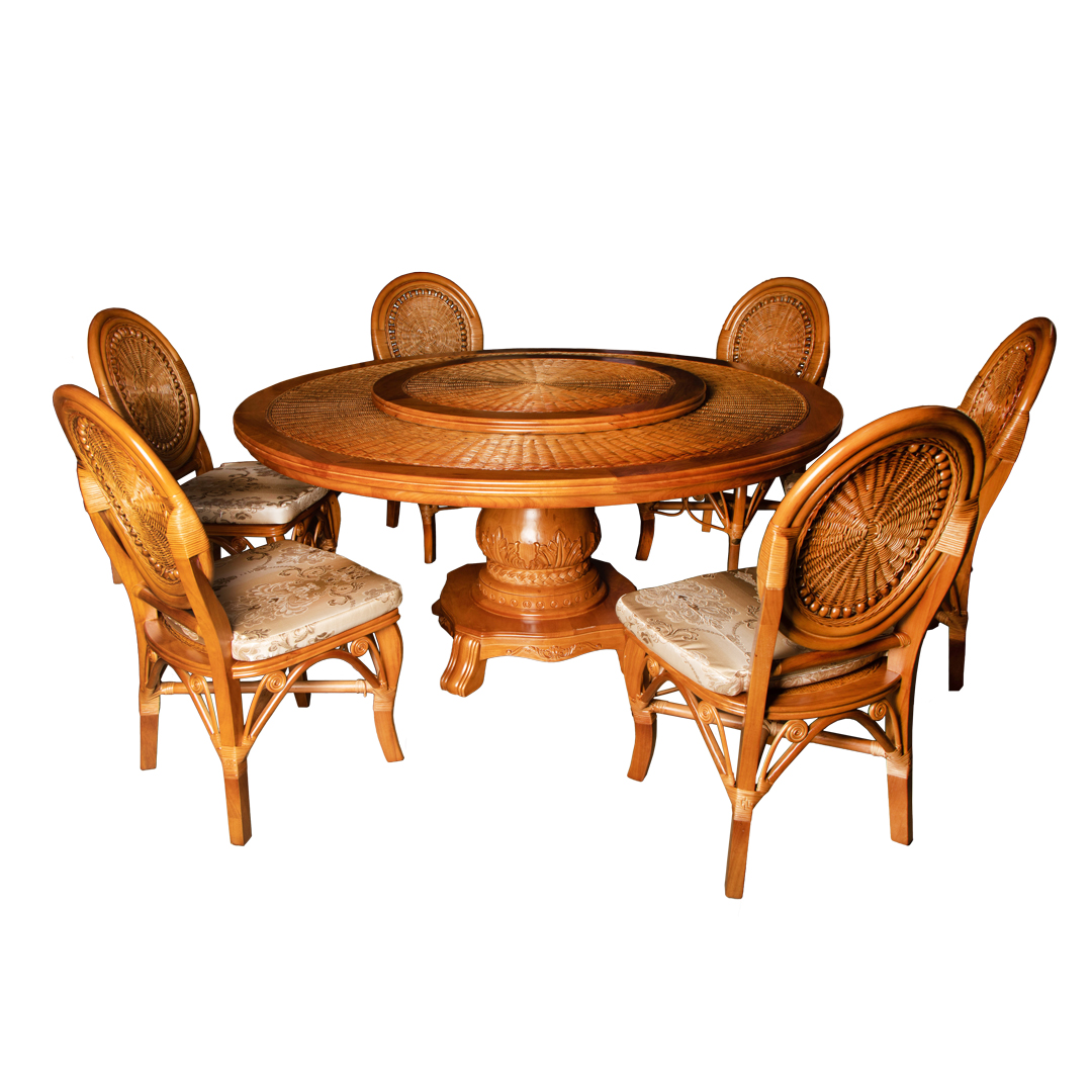 Обеденный комплект Ixora воплощает элегантность и функциональность. Изготовленный из натурального индонезийского ротанга, он включает круглый стол диаметром 160 см и высотой 80 см с поворотным элементом диаметром 90 см, облегчающим доступ к блюдам. Шесть стульев с мягкими вышитыми подушками из полиэстера обеспечивают комфорт во время трапезы. Бежевые и кофейные тона придают комплекту стильный вид, делая его превосходным выбором не только для дома, но и для использования в общественных местах, где ценят уют и качество.