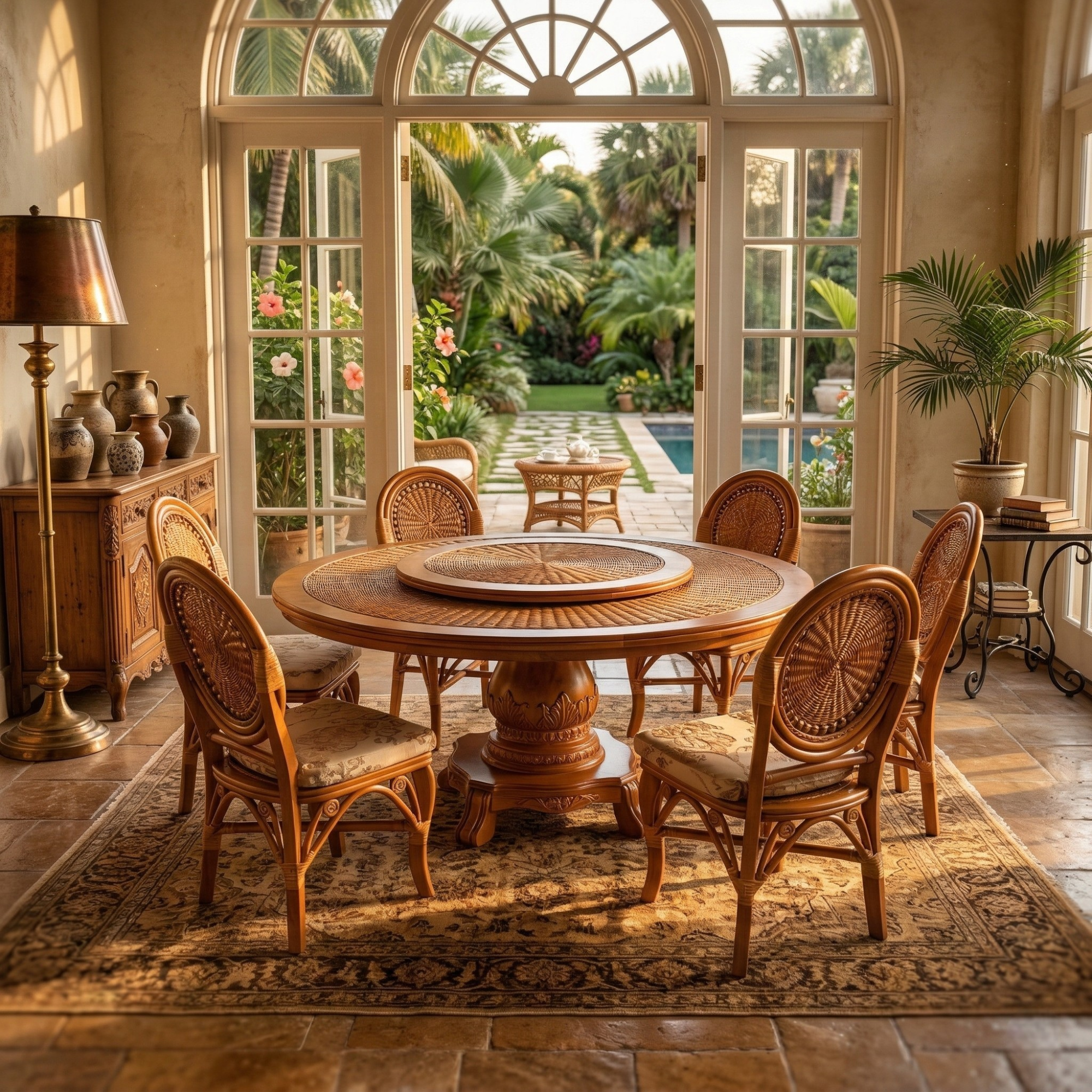 Обеденный комплект Ixora из натурального индонезийского ротанга с вышитыми подушками создаёт тёплую атмосферу с оттенком утончённости. Стол с поворотной вставкой и шесть глубоких стульев подойдут для просторной кухни, закрытой террасы или лаунж-зоны, где важны комфорт, выразительность и естественные материалы.
