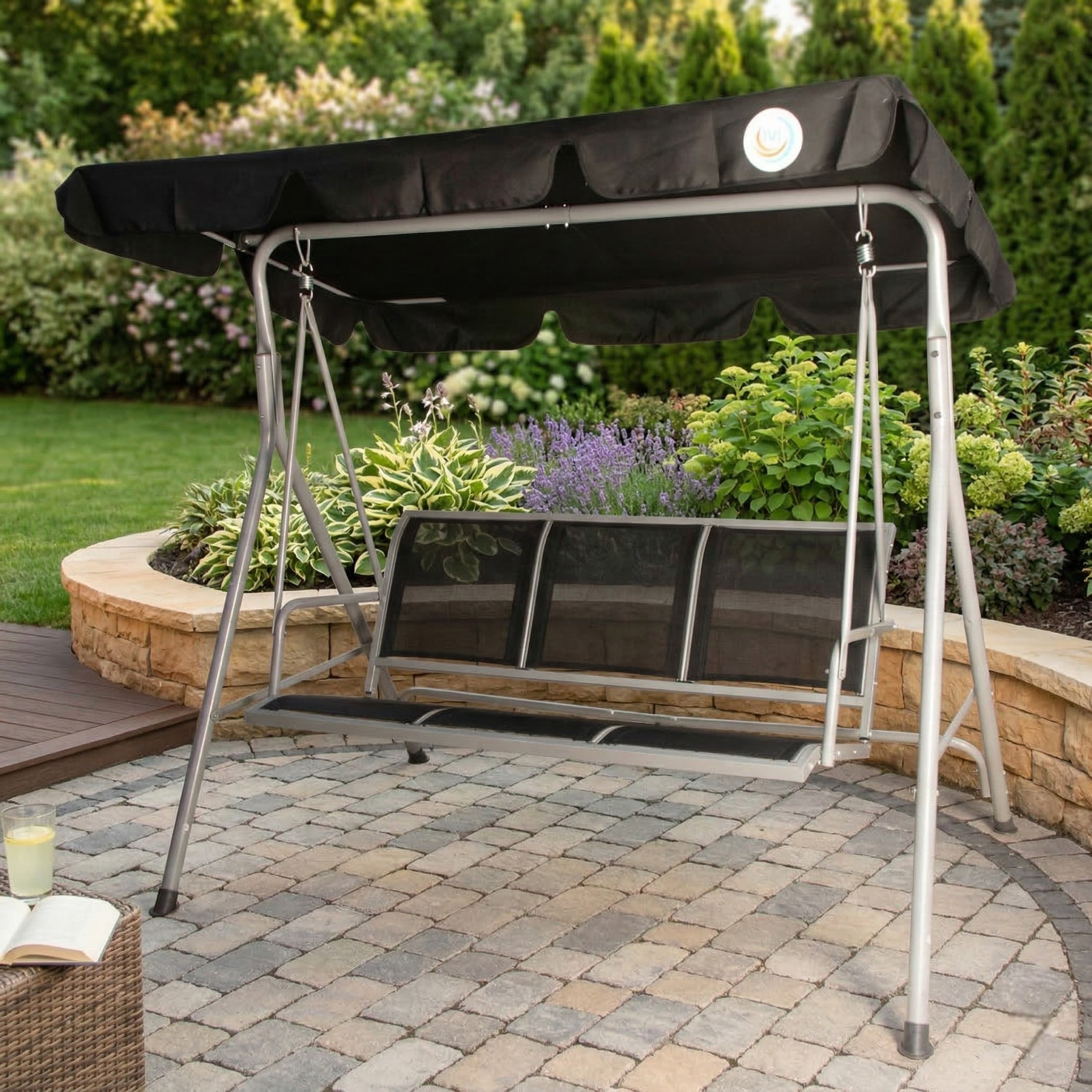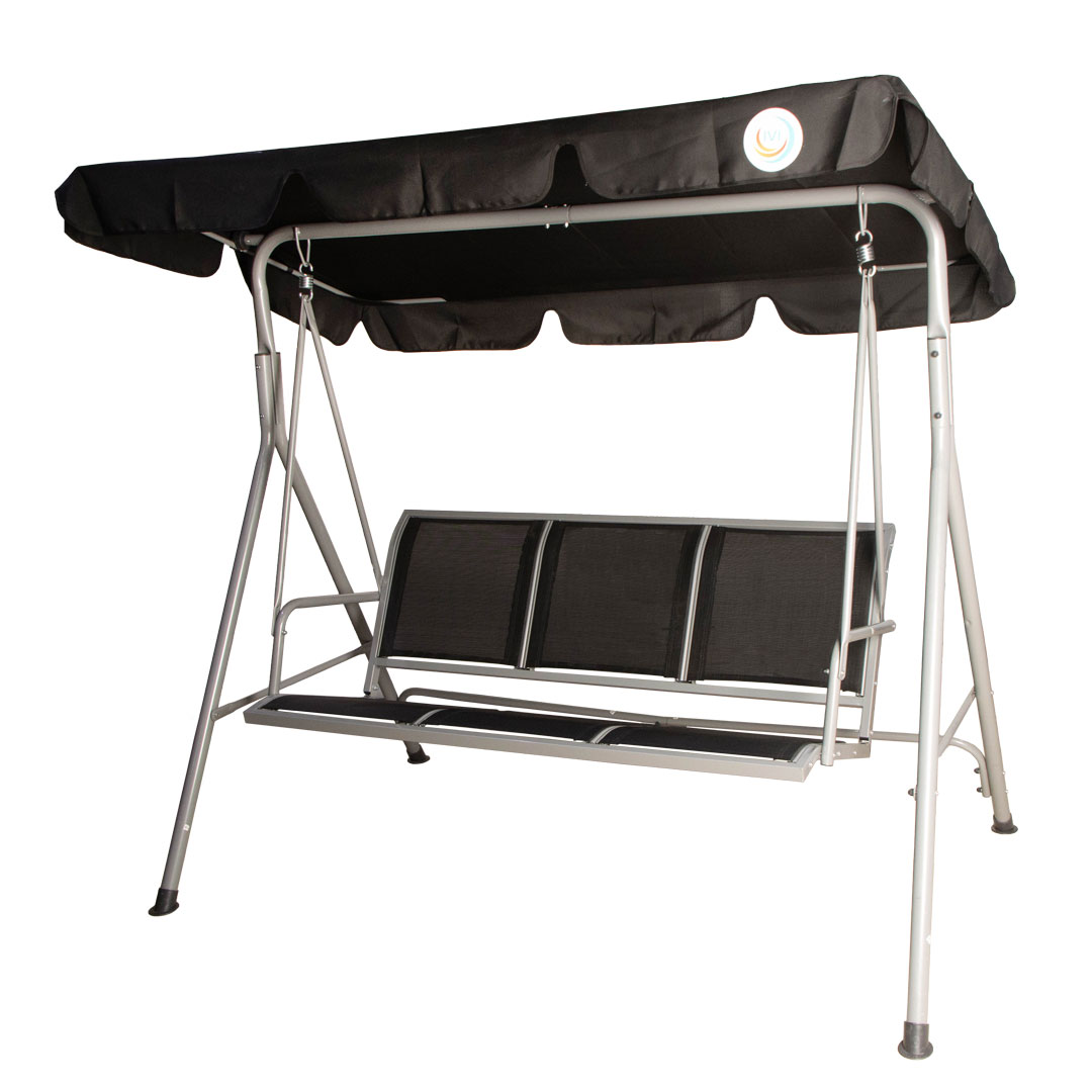 Великолепные садовые качели Duty приглашают вас окунуться в мир комфорта и безмятежных мгновений на свежем воздухе. Изготовленные из высококачественных материалов – металла, пластика и полиэстера, они станут неотъемлемой частью вашего сада, террасы или любого уютного уголка на открытом воздухе. Серый цвет каркаса и элегантные черные сиденья придают им современный и изысканный вид, идеально дополняющий любой ландшафт. Качели способны выдерживать нагрузку до 200 кг и рассчитаны на трех человек.