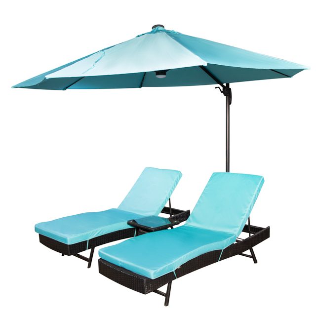 Шезлонги имеют подвижную секцию, позволяющую закреплять ее в пяти положениях. Грузоподьемность шезлонга составляет 120 кг. Подушки приятного бирюзового цвета сшиты из водоотталкивающего материала.