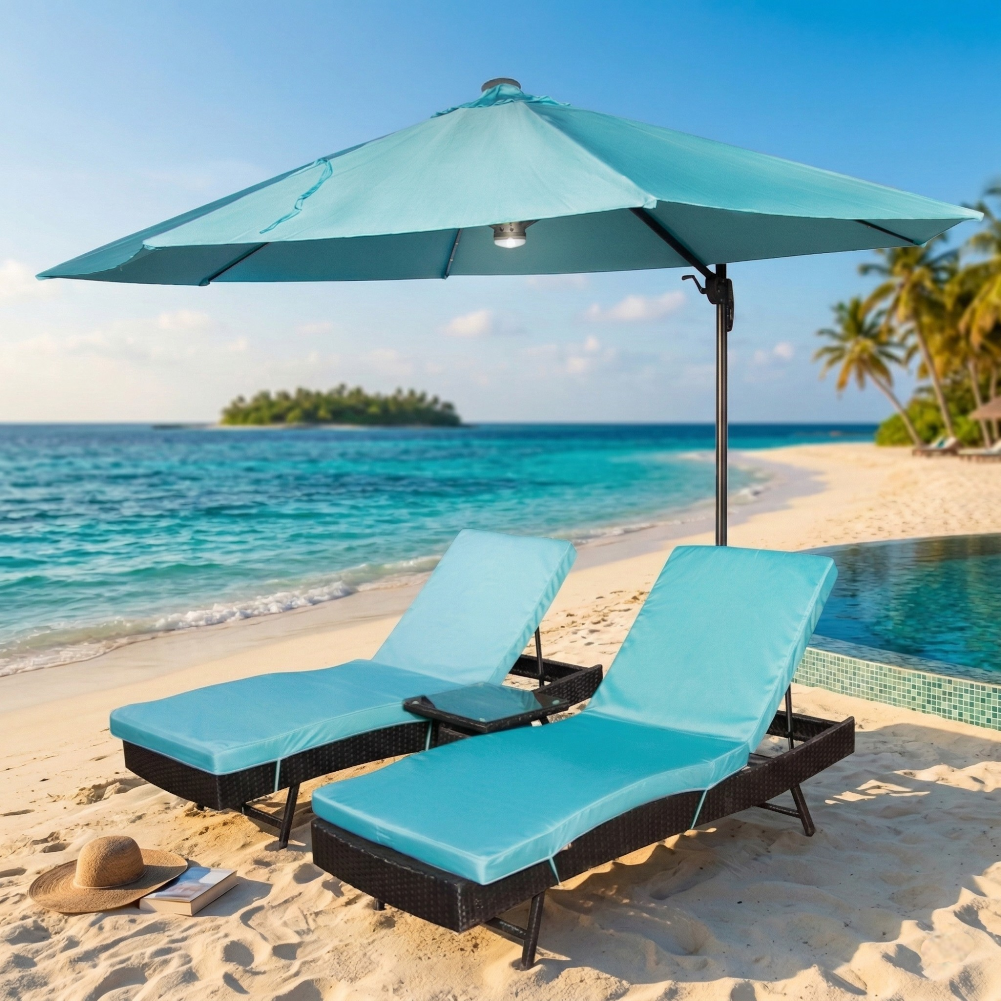 Высокий зонт с изумрудного цвета куполом имеет диаметр 240 см, и этого достаточно, чтобы обеспечить тень в этом райском уголке. Раскрывается он с помощью ручного механизма. Меньше минуты потребуется, чтобы привести его в рабочее положение, не затратив при этом лишних усилий.