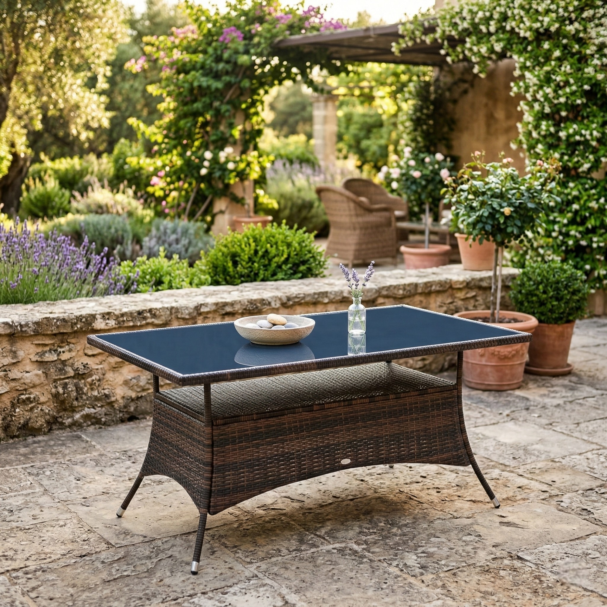 Прочность, которой отличается ротанговая мебель, обеспечена дополнительным металлическим каркасом. Внешний ротанговый слой защитит изделие от неприятных сюрпризов погоды, если вы решите расположить стол под открытым небом.